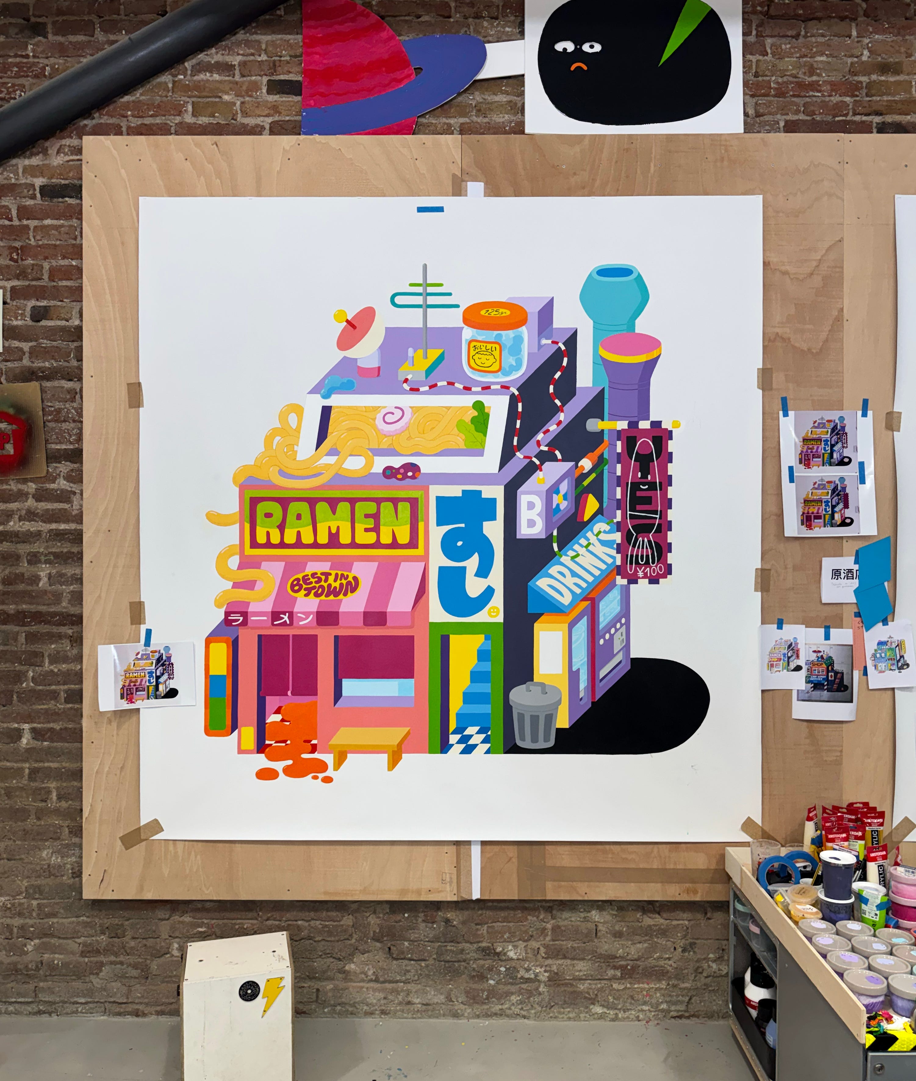 Hemos decidido no quedarnos paralizados, sino tratar de adaptarnos a estos cambios y, al mismo tiempo, potenciar aquello más humano que creemos que resulta mucho más difícil de emular de forma artificial. Como sabéis, una de estas líneas de experimentación creativa ha sido empezar a pintar cuadros de gran formato. Son piezas de 2x2 metros en las que creamos una serie de edificios muy coloridos. A diferencia de nuestro trabajo habitual, aquí no aparecen personajes ni tampoco utilizamos contornos en los dibujos. Por ahora hemos terminado cuatro cuadros y estamos muy ilusionados y satisfechos con los resultados. Nos encanta la paleta de colores que hemos conseguido, la fuerza y el impacto de las piezas, y además lo placentero del proceso: usar pinceles, mancharte los dedos con pintura acrílica... algo totalmente recomendable y muy sanador en estos tiempos de tantas pantallas.